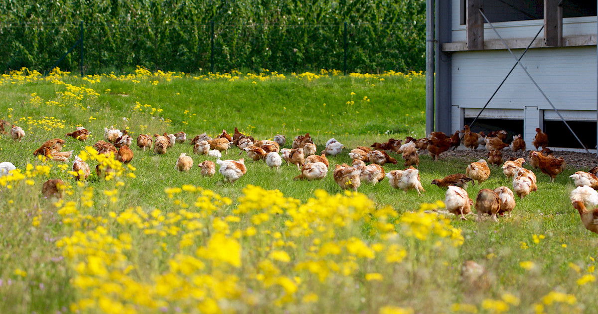 Der Frühling ist endlich da! Nach den kalten Wintermonaten können unsere Hühner wieder täglich auf die grünen Weiden. Frisches Gras, Insekten und mehr Bewegungsfreiheit sorgen für glückliche Tiere und beste Bio-Qualität. Die längeren Tage fördern zudem die natürliche Legeleistung. Besuche uns und erlebe, wie vital unsere Hühner in der Frühlingssonne sind!